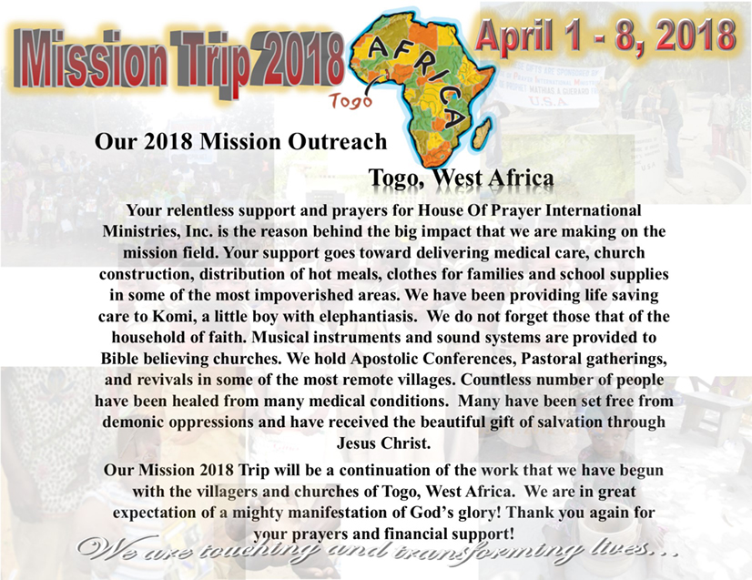 Mission is an important part of serving God. Proverb 19:17 says, " He who has pity on the poor lends to the Lord and He will pay back what he has given." We have mission connections mainly in Togo, West Africa and also in some other countries in Africa as well. As apart of our mission perspective in our church we pray corporately for the peace of Israel and sow into ministries that assist with the humanitarian needs of the Jewish people. The Lord declared, "I will bless those who bless you and I will curse him who curses you (Gen. 12:3)." Our mission work does not overlook the needs right here in the USA.